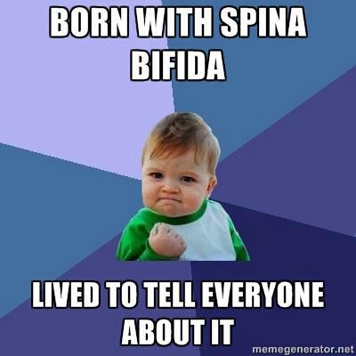 27. So, kids, remember way back in SB Fact #7 I talked about how med students study outdated SB information for like a day, then proceed to scare the crap out of expectant parents, who then have abortions 64% of the time? Well I’m not just making that up. I have it on good authority. I’ve been giving the same spiel for years and years when I talk to people about SB. Give them the basic facts, talk about how its more common than cystic fibrosis, muscular dystrophy, and multiple sclerosis combined, talk about the 166,000 people with SB living in this country. The usual. Well, I was doing that with my cousin. She had asked about my revisions in summer 2013. So we got to talking about SB. And she kept asking more and more questions about SB. How many people are affected. Basic stuff. Stuff I thought she should know because, did I mention she’s a doctor???? Like, a real honest to goodness doctor. And she had basic questions. That’s when I gave her another line that I’m always reciting when talking about SB. I always say “the problem is that med students are taught about SB for like a week in med school, and always given outdated information from the 1950s when most of us did die from urological or neurological problems. So they scare the crap out of parents by using bad info, so 64% of parents choose abortion.” Been saying that for years. Well. My cousin looked right at me and said something that I found terribly depressing. She said, “A week?? A week in med school? Not even a week. A day. One paragraph. You and SB are one paragraph in one day of med school.” She graduated med school only 6 years ago.