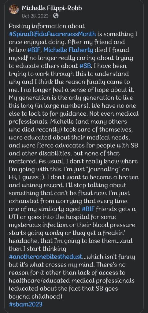 Someone as smart and strong and educated in SB as Michelle Flaherty, someone who knew what to look for with regards to her health, someone who went to the doctor when she was supposed to……and she can just….die, just like that from CoVid (and other SB related things that on their own could also have been deadly, but we’ll never know.) Its no wonder Michelle Robb doesn’t advocate as much as she used to. It’s disheartening. It’s depressing and disillusioning.
